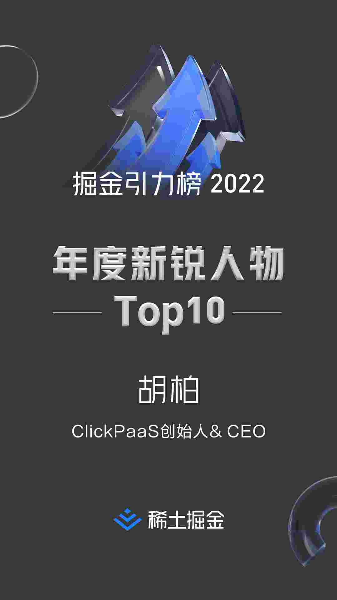 2022年1月6日,,稀土掘金社区第一届「掘金未来大会」成功举办,,,,会上发布了“2022 稀土掘金引力榜 年度新锐人物”榜单,,上海爱湃斯科技有限公司(简称VIVO钱包)创始人及CEO胡柏实力入选年度新锐人物TOP 10。。